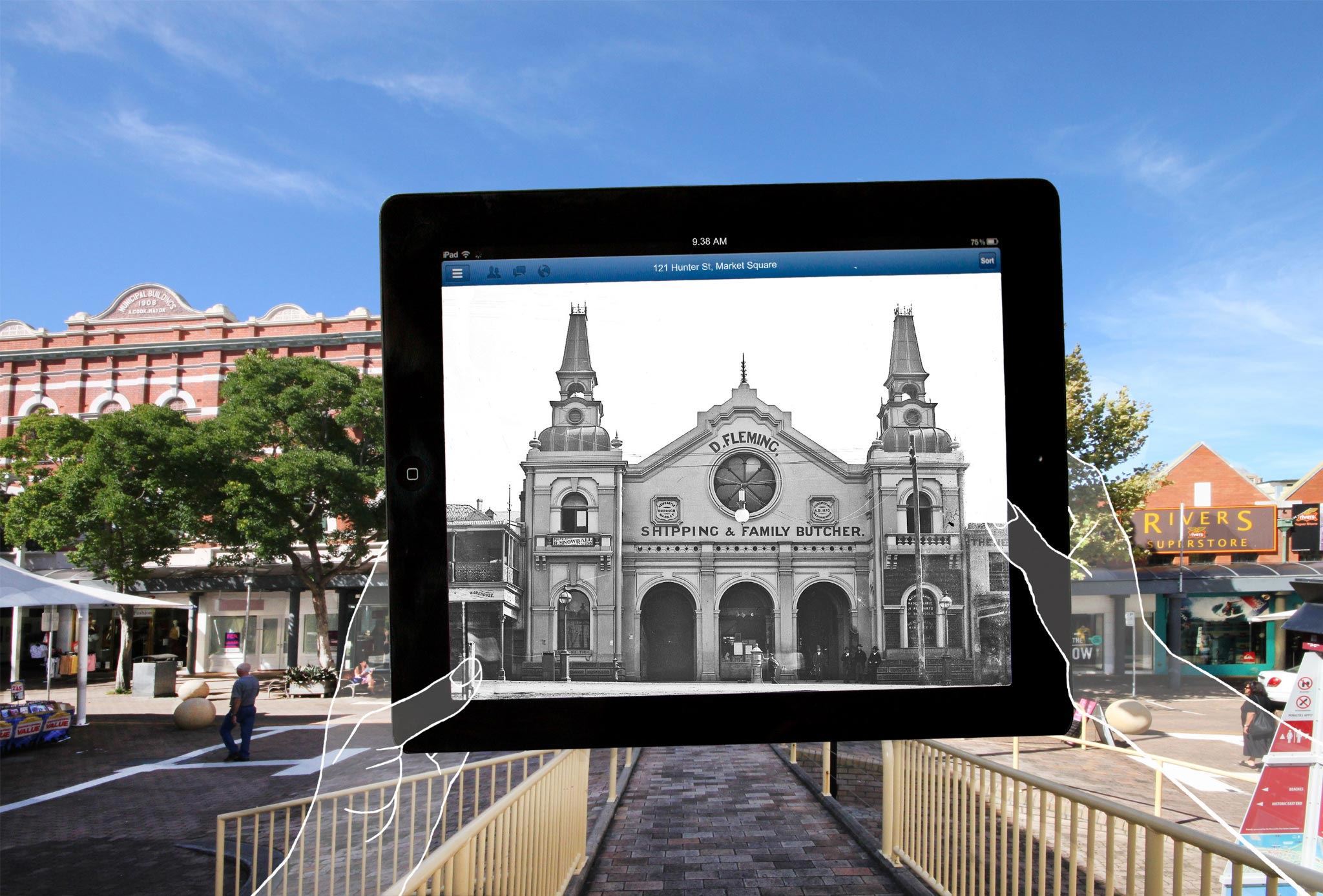 By downloading a free application you can walk around Newcastle and see the lost Victorian City. You will be see a butcher in Hunter Street from a hundred and twenty years ago, proudly showing his produce; the public buildings; the old Post Office being built; large and imposing hotels, and landmarks all in their original positions. The images in the exhibition represent the essence of the project and will give the viewer an understanding of the lost Victorian city.