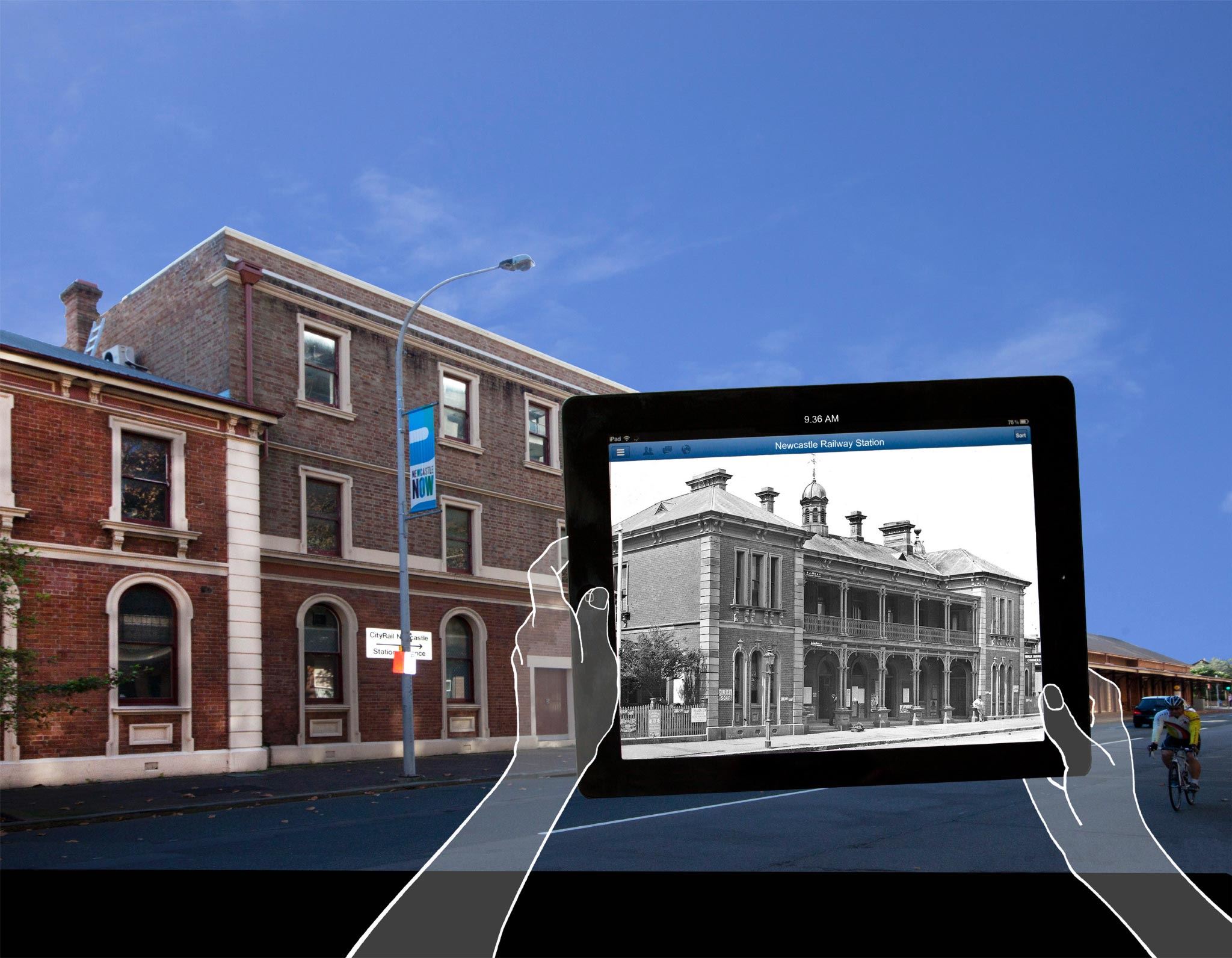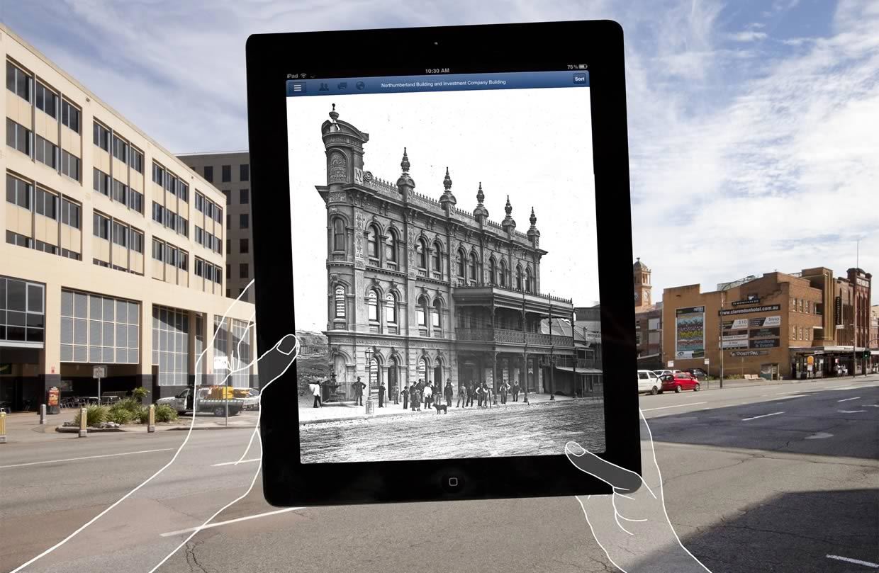 The exhibition introduces a project developed by Tessa Morrison, Helen Giggins and Nicholas Foulcher from the School of Architecture and Built Environment at the University of Newcastle. It consists of 30 images which show the architecture of past and present, PowerPoints showing the continuous growth of the city through time and a video showing how and where the visitor can view these images in situ at at least 20 sites through the city using their mobile phones or iPads.