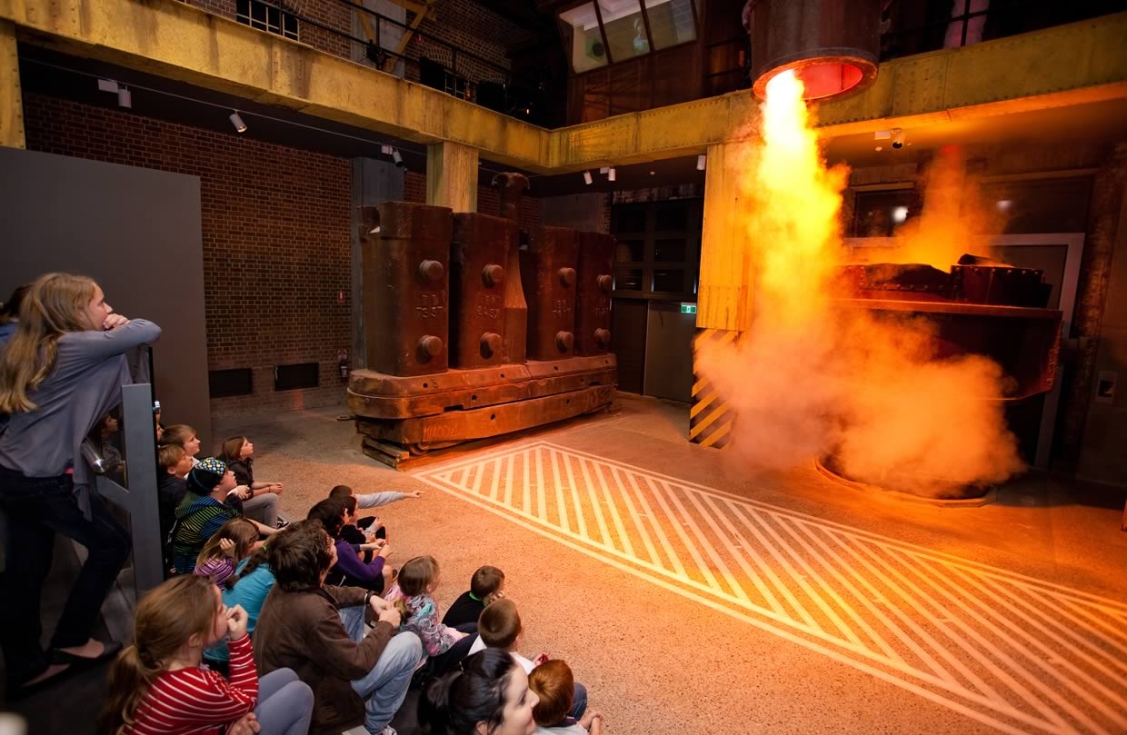 In 2011, Mental Media was commissioned by The City of Newcastle to design, produce and install ‘a dramatic audiovisual program which will interpret the excitement, colour, drama and noise which is inherent in the steelmaking process’. All of this is to be achieved without anyone getting hurt, burnt or too dirty. An important part of the brief was to enliven the exhibition, expand the visitors’ experience and ‘help to interpret the very large objects on display in the exhibition’. In other words, to impress visitors with the size and scope of the steelmaking process. That was going to take some good, old-fashioned theatrical magic.