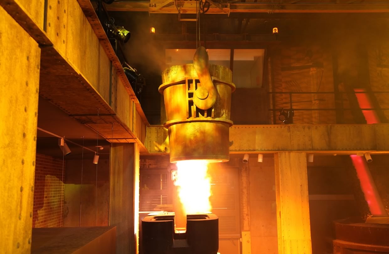 The presentation, which runs on the hour, every hour, has a ghostly host. A somewhat grumpy 'Harry' greets visitors and invites them to stick around to watch an ingot pour which, everyone is warned, is going to be loud, hot and dangerous. Harry narrates the five-minute show explaining the steel making process which includes a steel pour from a prop furnace into a real ladle (one of the museum objects), a simulated ladle transit across the 18m wide room at ceiling height and finally a steel pour from the ladle into an ingot car (the second museum object).